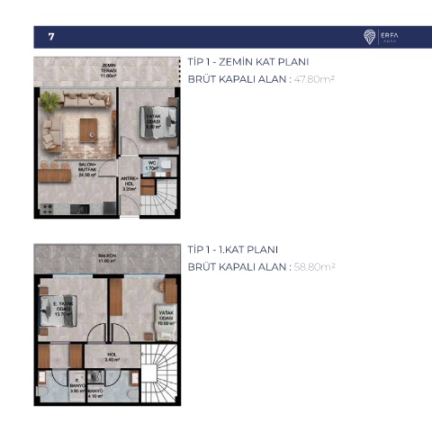 7 TİP 1 - ZEMİN KAT PLANI BRÜT KAPALI ALAN : 47.80m2 TİP 1 - 1.KAT PLANI BRÜT KAPALI ALAN : 58.80m2